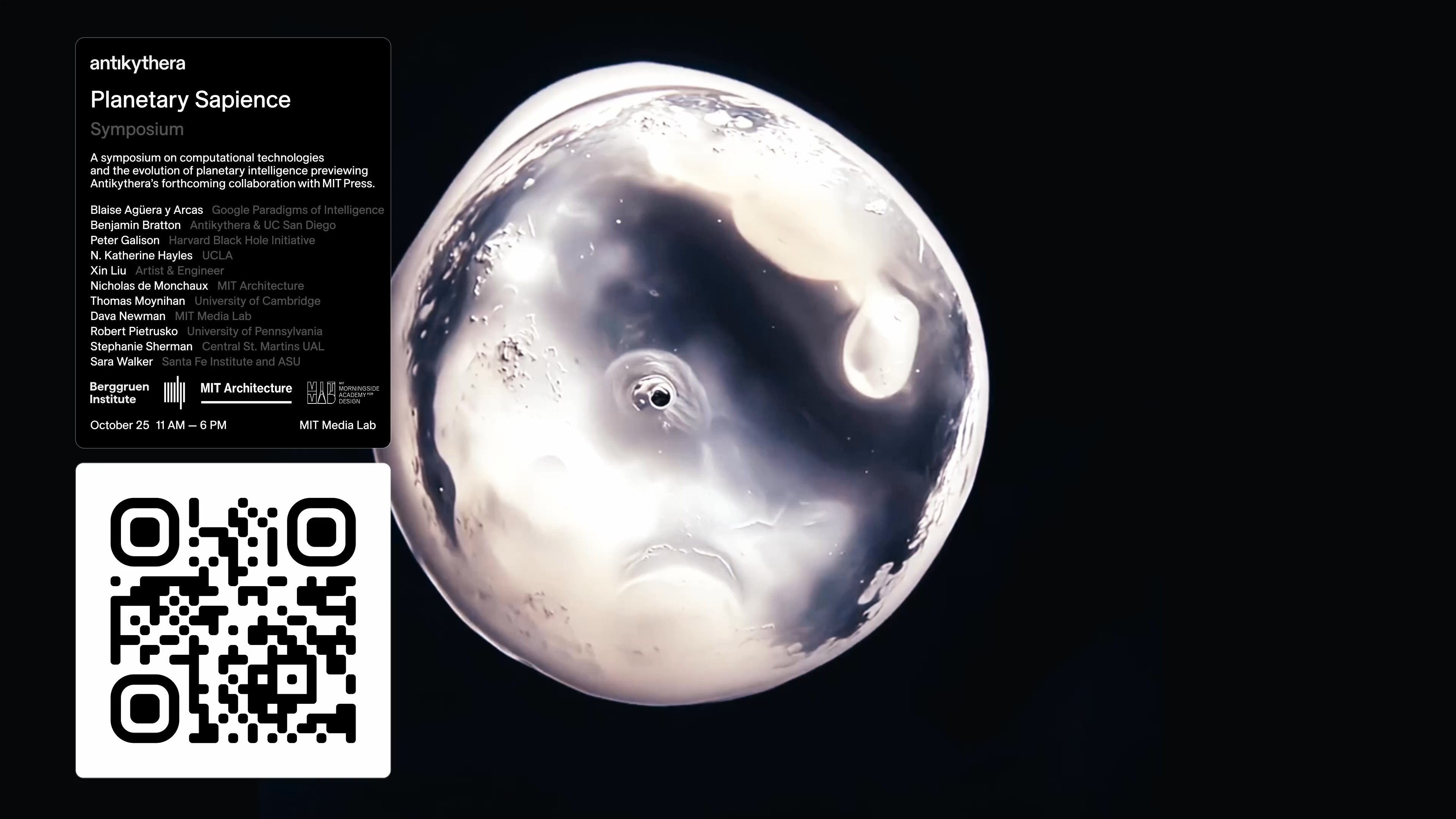 Last point of introduction to the program before I turn to the planetary sapience itself is that Antikythera runs studios every year. One of the core aspects and structure of our program is the design studios that we run every year. The next studio will be held here at MIT in 2025 over the early summer and we look forward to the opportunity to collaborate with some of you all.
